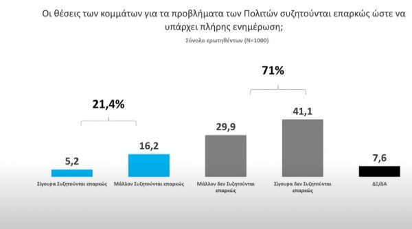 Ωστόσο, η μεγάλη πλειοψηφία των πολιτών (71%) τονίζει ότι οι θέσεις των κομμάτων για τα προβλήματά τους δεν συζητούνται επαρκώς, ώστε να υπάρχει πλήρης ενημέρωση, και μόνο το 21,4% θεωρεί ότι συζητούνται επαρκώς.