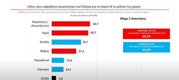 Χαρακτηριστικό είναι, πάντως, πως οι λέξεις που εκφράζουν περισσότερο τον Έλληνα για το παρόν και το μέλλον της χώρας είναι αρνητικές, όπως παραίτηση και απογοήτευση (42,7%) και η οργή (40,7).