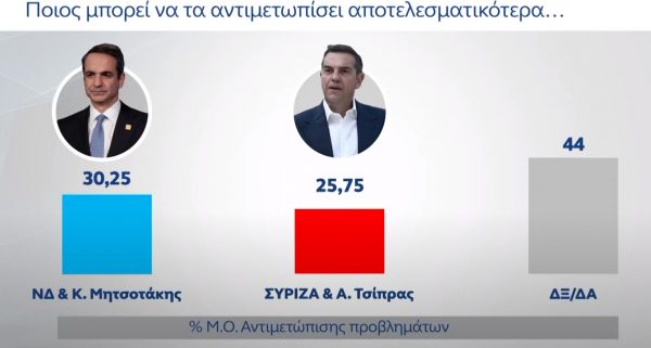 Το ενδιαφέρον στη δημοσκόπηση είναι πως η πλειοψηφία (30,25%) των πολιτών πιστεύει ότι, κατά μέσο όρο, ο Κυριάκος Μητσοτάκης είναι εκείνος που μπορεί να αντιμετωπίσει αποτελεσματικότερα όλα αυτά τα προβλήματα, με τον Αλέξη Τσίπρα να μην απέχει πολύ σε ποσοστό (25,75%).