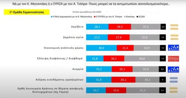 Αντίστοιχα, ο πρόεδρος του ΣΥΡΙΖΑ υπερτερεί στην αντιμετώπιση προβλημάτων που έχουν να κάνουν με την ακρίβεια (28,3%), τη δημόσια υγεία (27,4%), την έλλειψη διαφάνειας και τη διαφθορά (26,1%), την ορθή λειτουργία του κράτους σε θέματα αποφυγής δυστυχημάτων, όπως τα Τέμπη (25,6%), τη διευθέτηση του ιδιωτικού χρέους νοικοκυριών και επιχειρήσεων με ευνοϊκούς όρους, δηλαδή τα δάνεια (29,3%), τη δημόσια παιδεία (27,1%), την προστασία της πρώτης κατοικίας και των μικρομεσαίων επιχειρήσεων από «κόκκινα» δάνεια και πλειστηριασμούς (29,4%), καθώς και την ποιότητα του πολιτεύματος, με αναφορά στις υποκλοπές (27,7%).