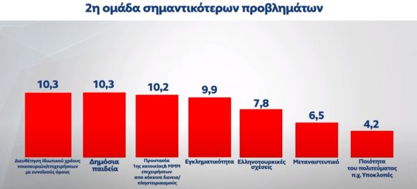 Στη «δεύτερη» ομάδα των σημαντικότερων προβλημάτων που αντιμετωπίζουν, οι συμμετέχοντες στη δημοσκόπηση ανέδειξαν πρώτη (10,3%) τη διευθέτηση του ιδιωτικού χρέους νοικοκυριών και επιχειρήσεων με ευνοϊκούς όρους – δηλαδή τα δάνεια – τη δημόσια παιδεία με το ίδιο ποσοστό (10,3%), αμέσως μετά (10,2%) την προστασία της πρώτης κατοικίας και των μικρομεσαίων επιχειρήσεων από «κόκκινα» δάνεια και πλειστηριασμούς, την εγκληματικότητα (9,9%), τις ελληνοτουρκικές σχέσεις (7,8%), το μεταναστευτικό (6,5%) και τελευταία την ποιότητα του πολιτεύματος, με αναφορά στην υπόθεση των υποκλοπών (4,2%).