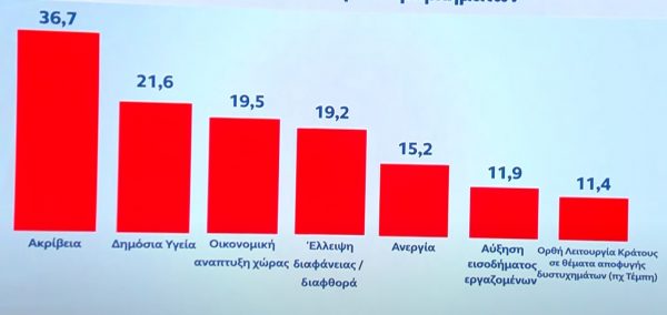 Οι πολίτες που συμμετείχαν στην έρευνα της MRB, λοιπόν, δήλωσαν πως τα πιο σημαντικά προβλήματα που αντιμετωπίζουν είναι η ακρίβεια (36,7%), η δημόσια υγεία (21,6%) – ένας πολύ κρίσιμος τομέας, που δεν αναδεικνύεται ιδιαίτερα στις δημοσκοπήσεις – η οικονομική ανάπτυξη της χώρας (19,5%), η έλλειψη διαφάνειας και η διαφθορά (19,2%), η ανεργία (15,2%), η αύξηση εισοδήματος των εργαζομένων (11,9%) και η ορθή λειτουργία του κράτους σε θέματα αποφυγής δυστυχημάτων, όπως τα Τέμπη (11,4%).