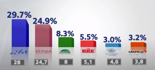Υπενθυμίζεται ότι η δημοσκόπηση της MRB δίνει προβάδισμα 4,8 μονάδων στη Νέα Δημοκρατία (29,7%) έναντι του ΣΥΡΙΖΑ (24,9%), ενώ το ΠΑΣΟΚ του Νίκου Ανδρουλάκη (8,3%) δεν φαίνεται, ούτε σε αυτή τη δημοσκόπηση, να συγκεντρώνει το «ισχυρό διψήφιο» ποσοστό που επιδιώκει προκειμένου να συμμετάσχει σε μία κυβέρνηση συνεργασίας.