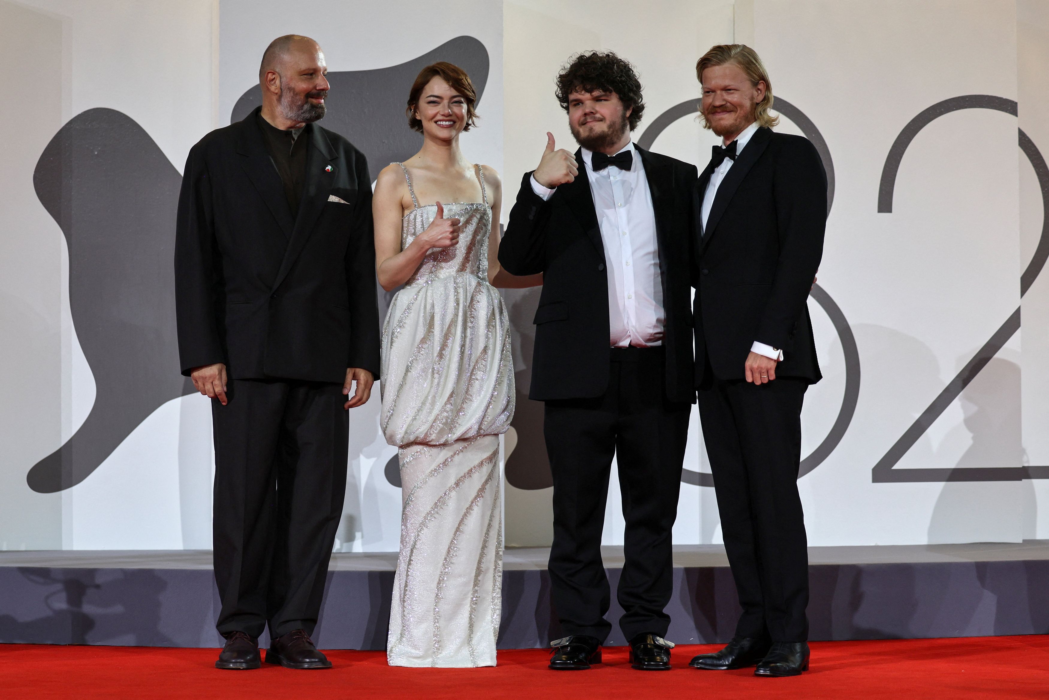 Director Yorgos Lanthimos, cast members Emma Stone, Aidan Delbis and Jesse Plemons pose on the red carpet for the screening of the movie «Bugonia» in competition, at the 82nd Venice Film Festival, in Venice, Italy, August 28, 2025. REUTERS/Yara Nardi