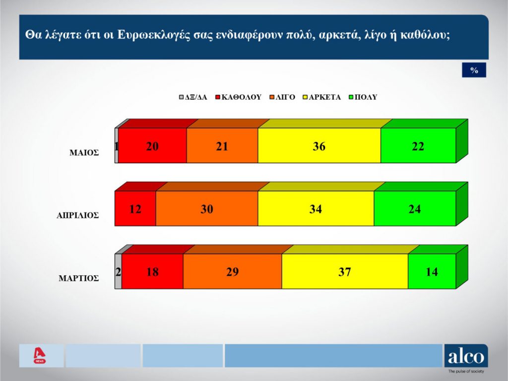 Στο δεύτερο μέρος της δημοσκόπησης της ALCO, για λογαριασμό του Alpha, το ενδιαφέρον των πολιτών για τις ευρωεκλογές παραμένει στο 58%, όπως ήταν και στη μέτρηση του Απριλίου, παρά το γεγονός ότι σε ποσοστό 80% οι ψηφοφόροι λένε ότι οι αποφάσεις στην Ε.Ε επηρεάζουν «πολύ ή αρκετά» τη ζωή μας.