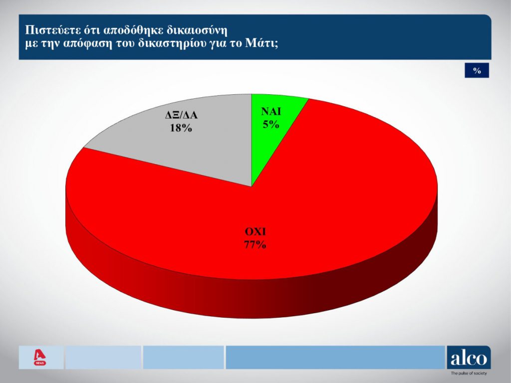 Στα ζητήματα που απασχόλησαν και απασχολούν μέχρι σήμερα την ελληνική κοινωνία το 77% των συμμετεχόντων στην έρευνα αναφέρουν ότι δεν αποδόθηκε δικαιοσύνη για την τραγωδία στο Μάτι, στη δίκη που ολοκληρώθηκε πρόσφατα σε πρώτο βαθμό.