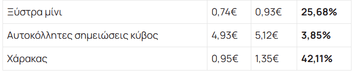 Σε πρόσφατη δειγματοληπτική έρευνα αγοράς σε αλυσίδες σούπερ μάρκετ, καταγράφονται σημαντικές ανατιμήσεις σε βασικά σχολικά είδη, όπως ενδεικτικά, σε τετράδια, μολύβια, μαρκαδόρους, γεωμετρικά σχήματα και άλλα σχολικά προϊόντα όπου οι αυξήσεις κυμαίνονται από 3,85% έως και 54,26% σε σχέση με το προηγούμενο έτος.